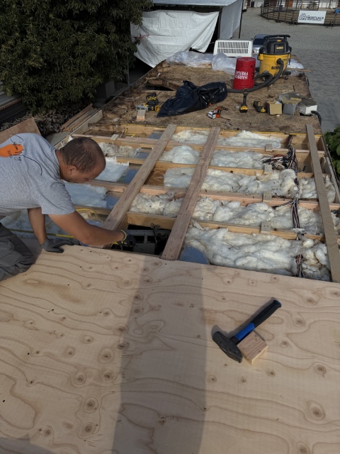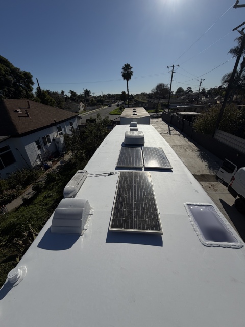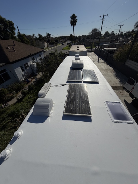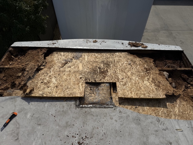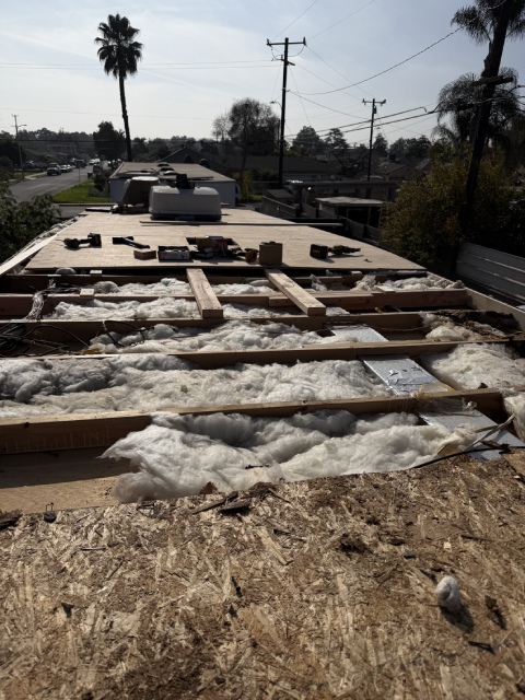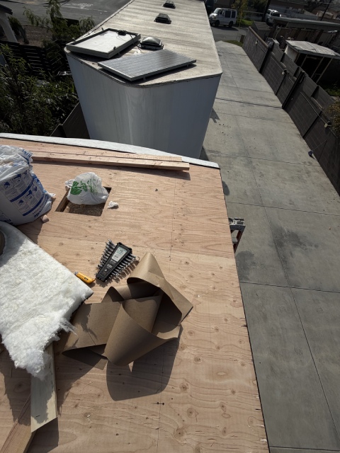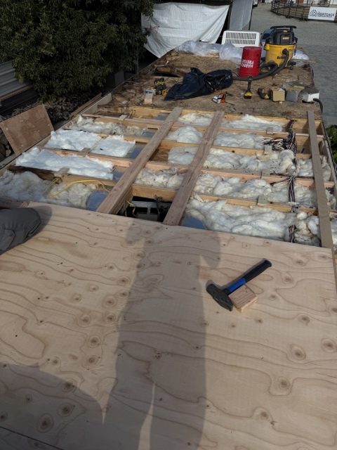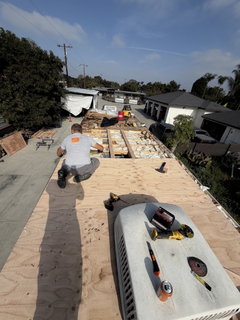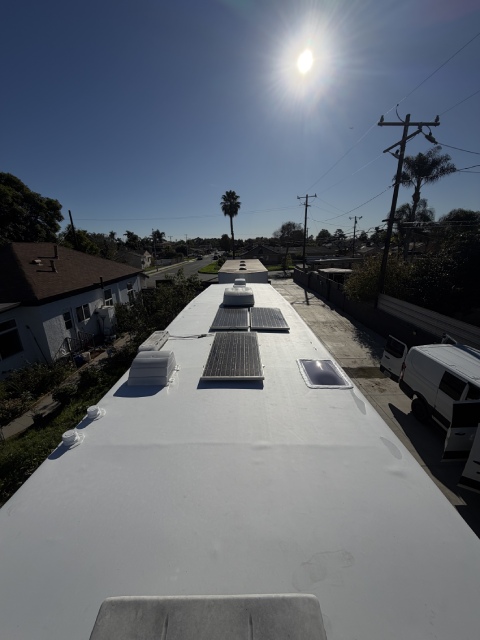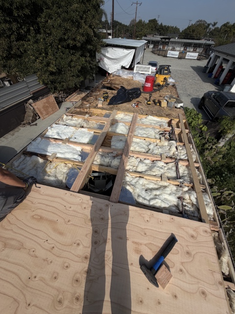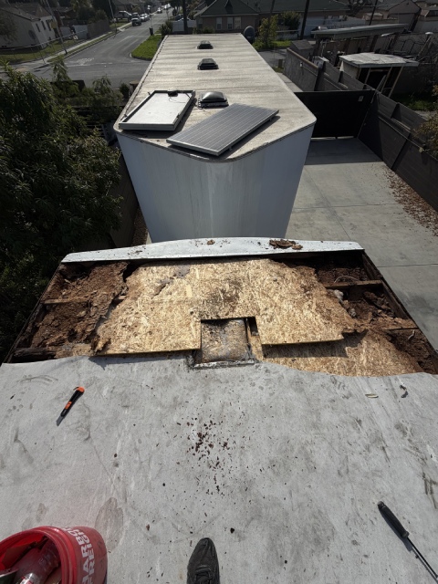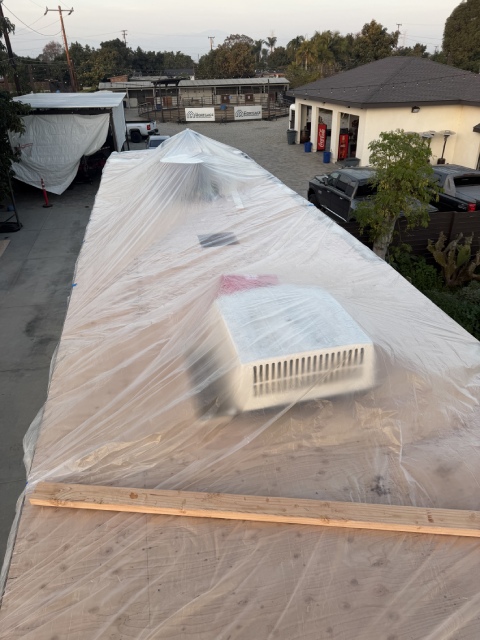 This 40-foot trailer had extensive roof water damage. We removed the damaged structure and rebuilt the roof from scratch, installing a new frame, plywood, insulation, roof membrane, vents, and a skylight.