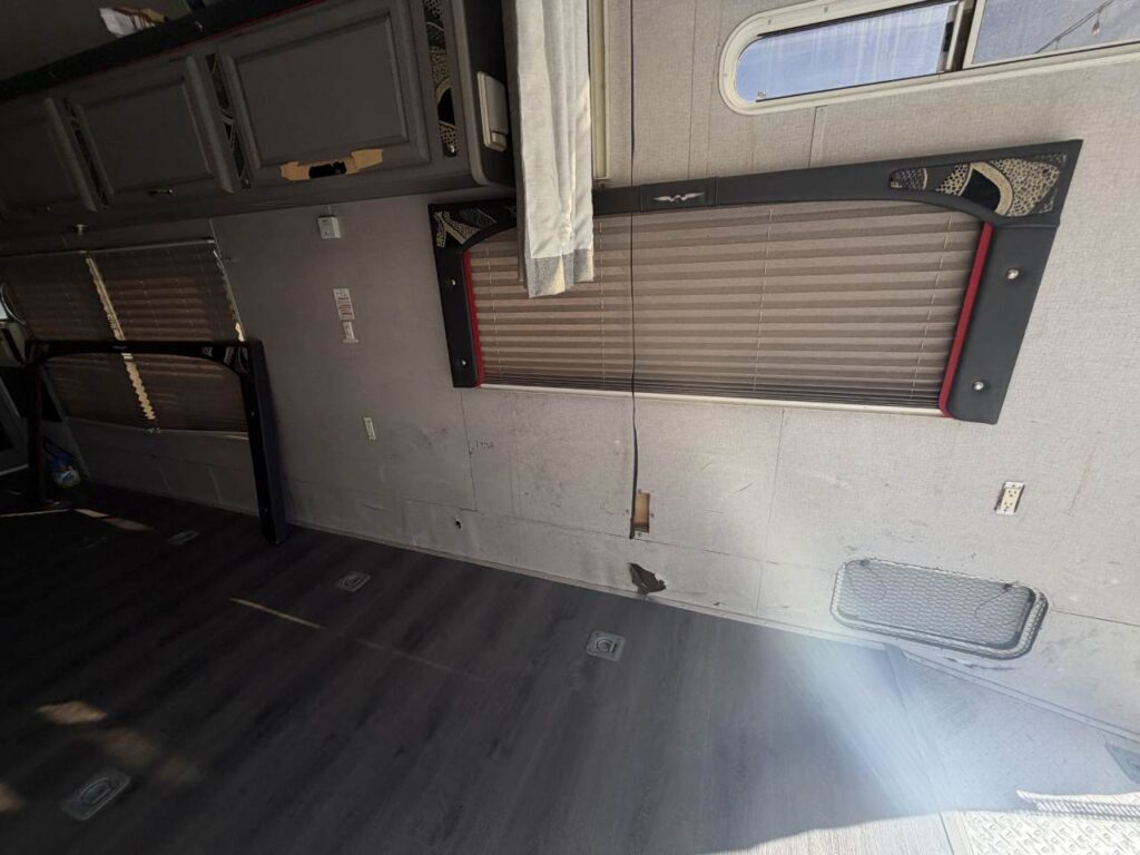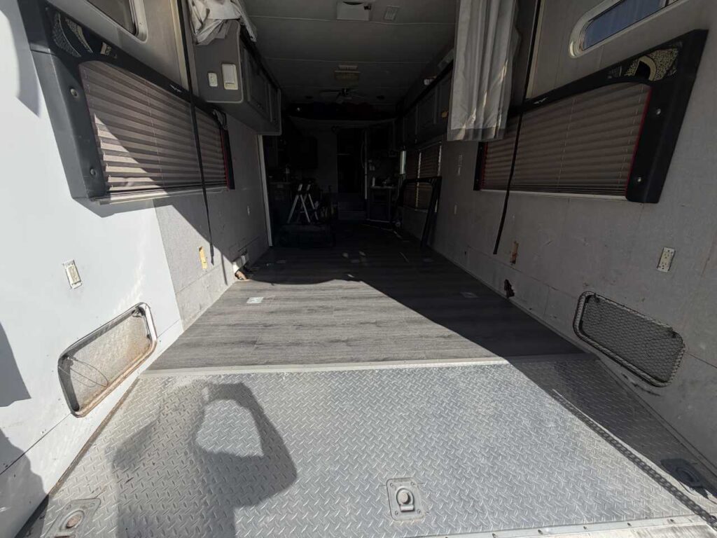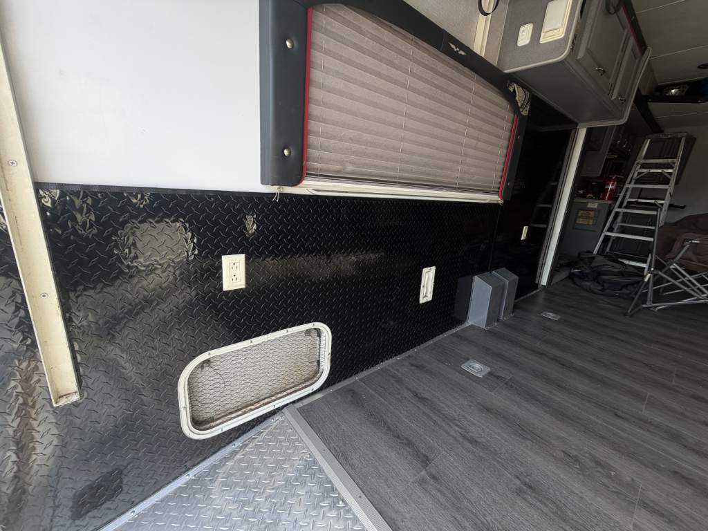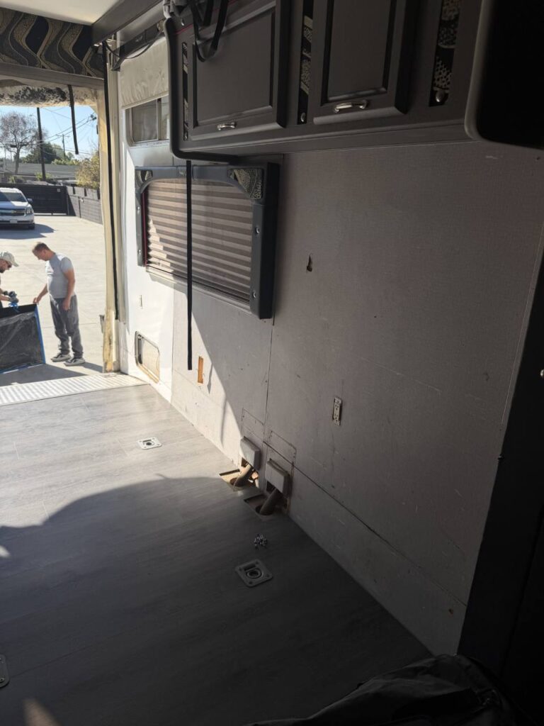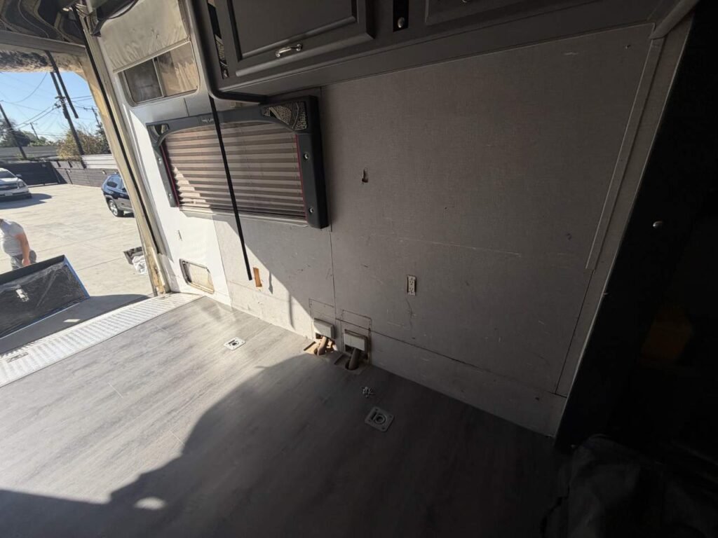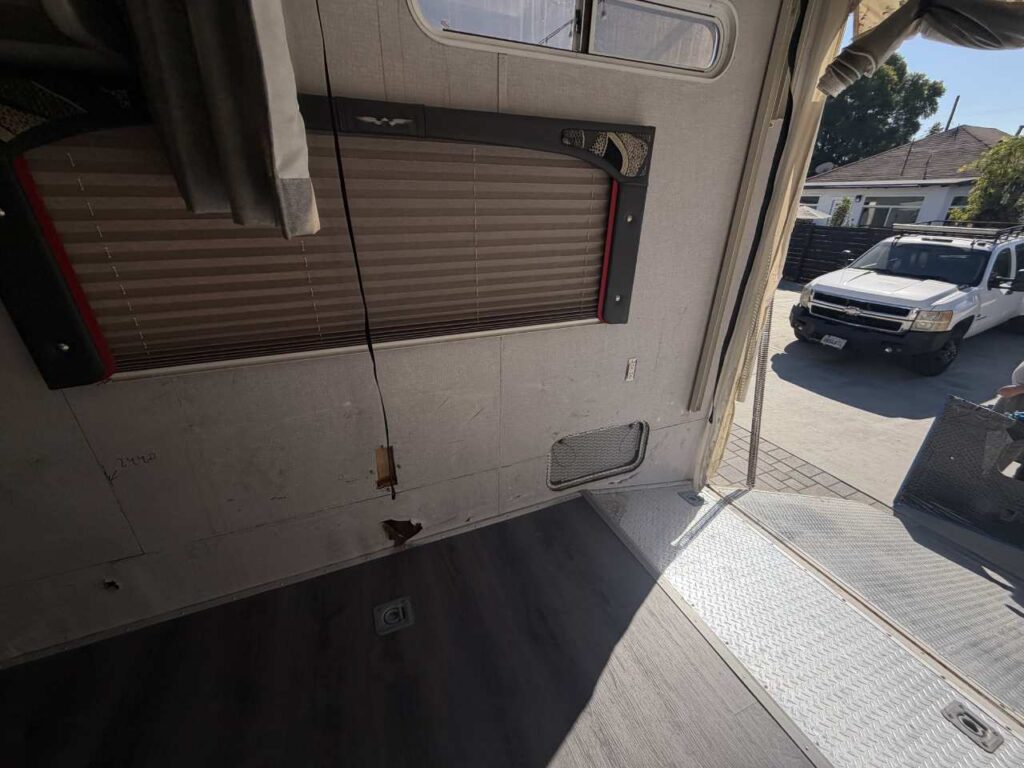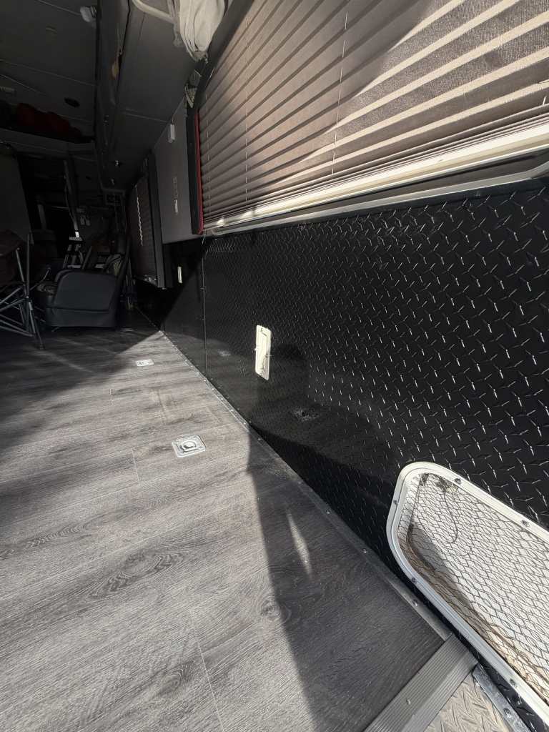 So, we chose a solution that balances durability and style. Aluminum diamond sheets offer strength and a clean custom look. Below, you can see the trailer’s condition before the repair. Just after that, you’ll see the final result of our custom Toy Hauler wall repair.