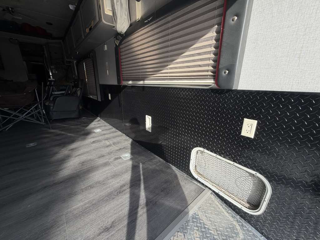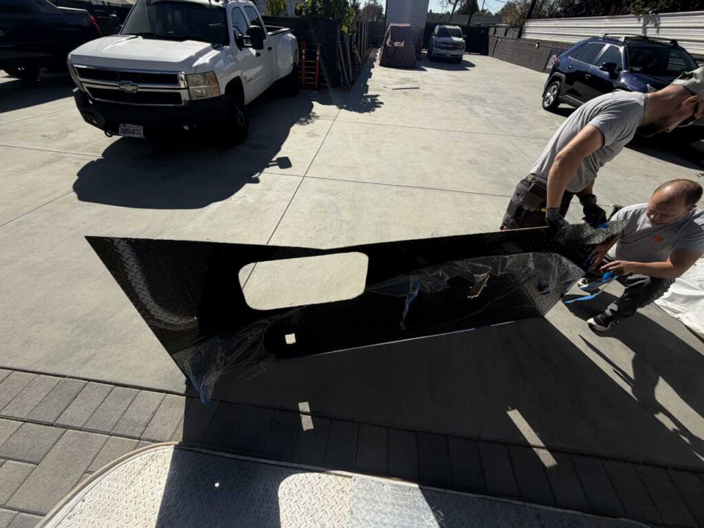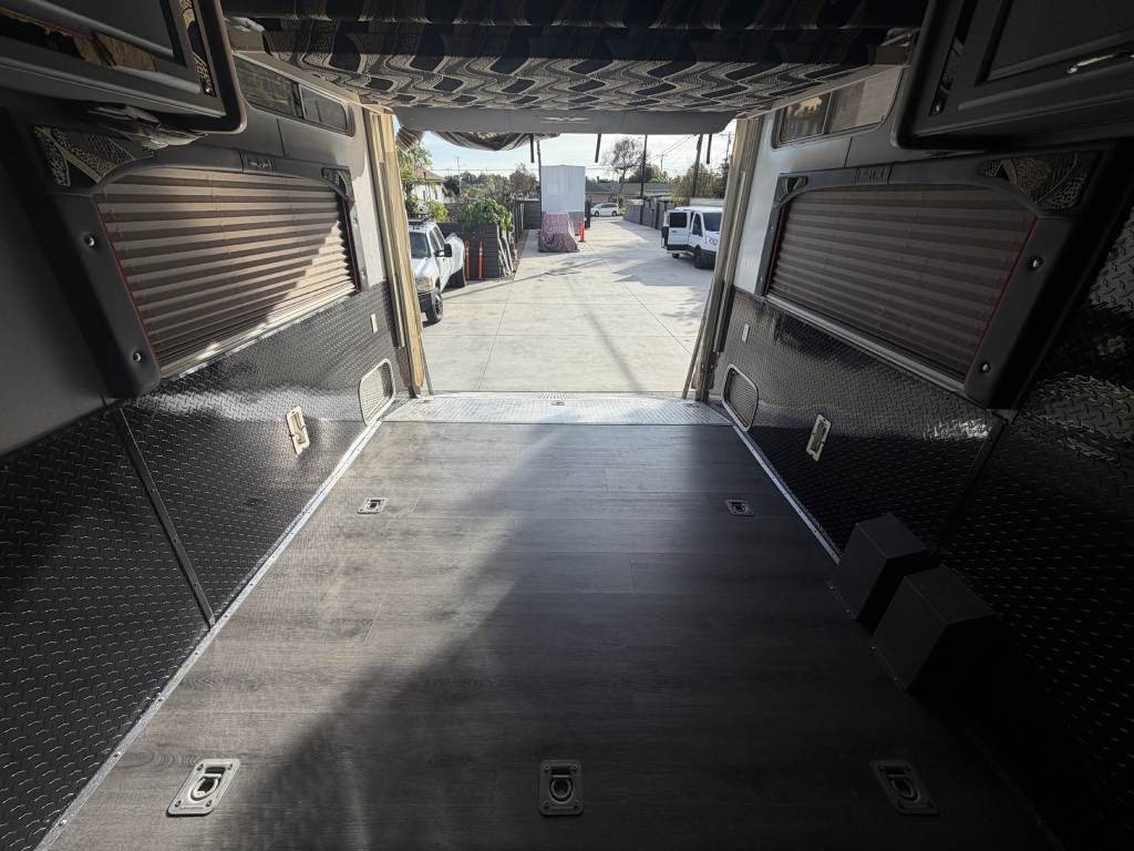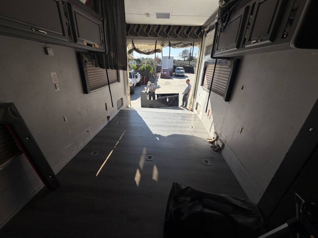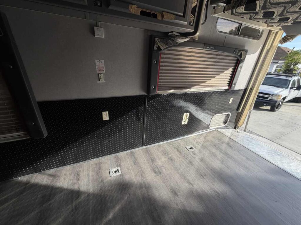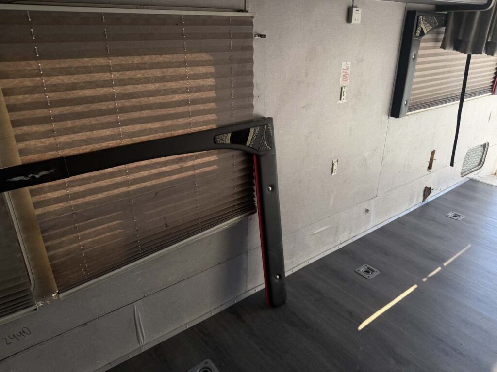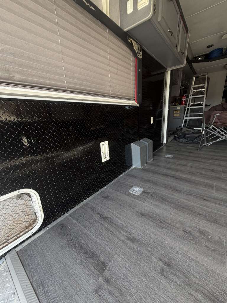 So, we chose a solution that balances durability and style. Aluminum diamond sheets offer strength and a clean custom look. Below, you can see the trailer’s condition before the repair. Just after that, you’ll see the final result of our custom Toy Hauler wall repair.