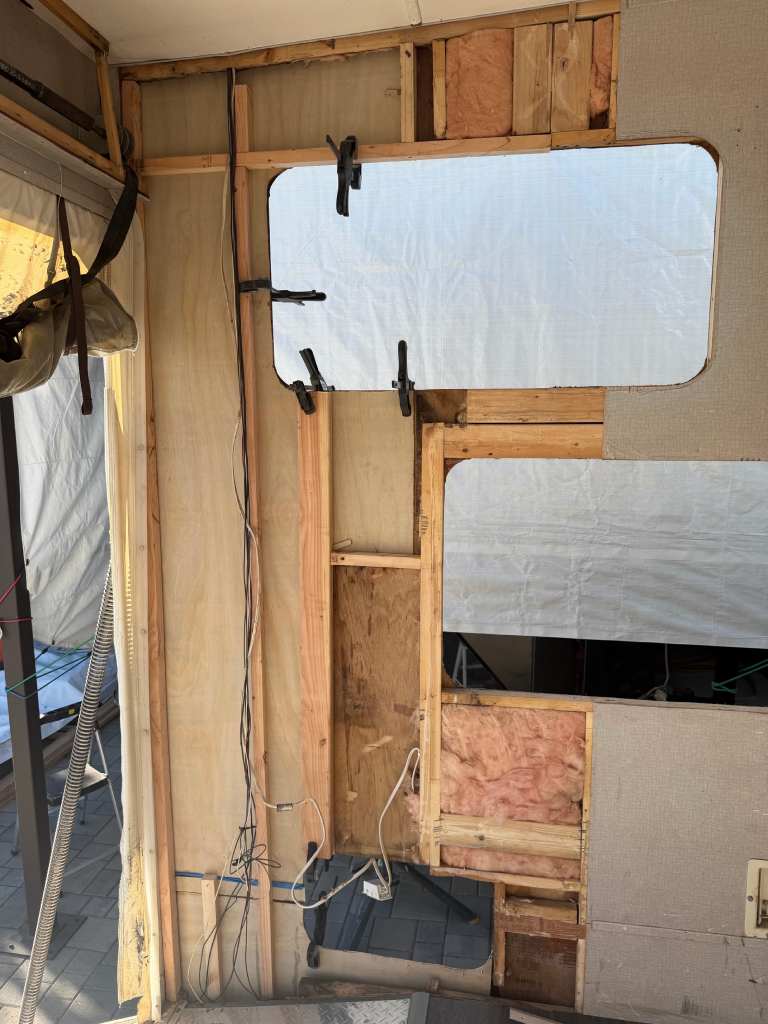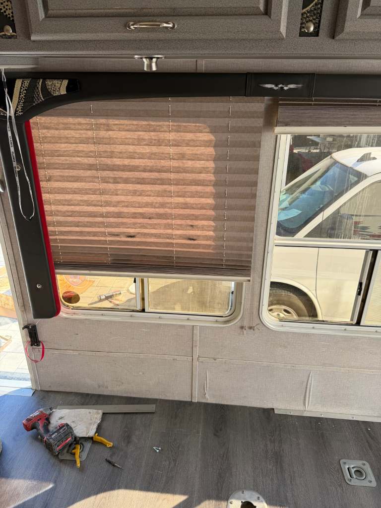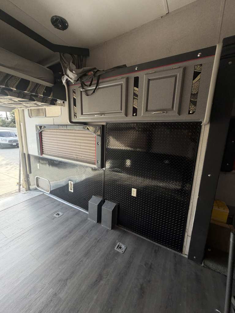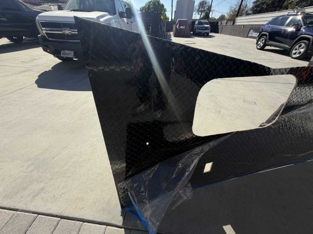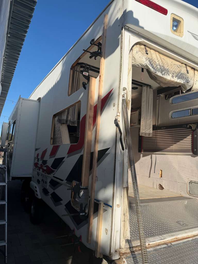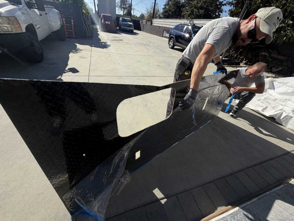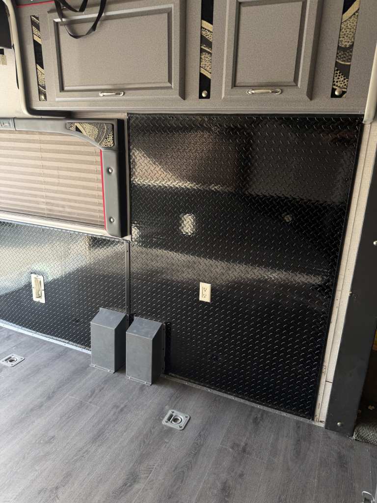 So, we chose a solution that balances durability and style. Aluminum diamond sheets offer strength and a clean custom look. Below, you can see the trailer’s condition before the repair. Just after that, you’ll see the final result of our custom Toy Hauler wall repair.