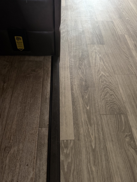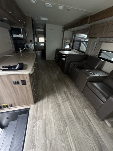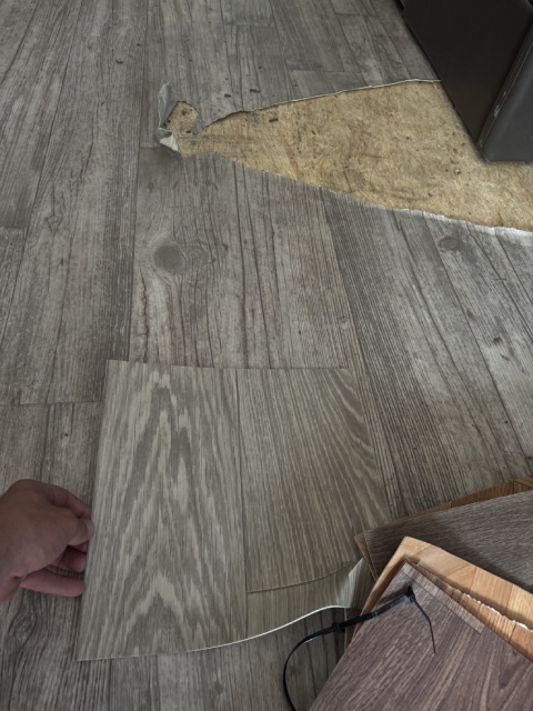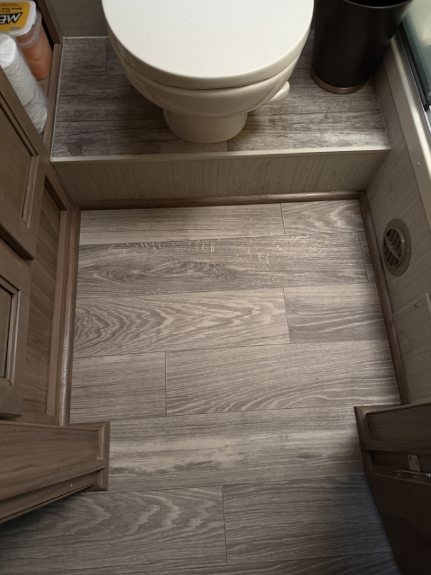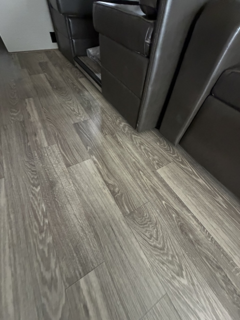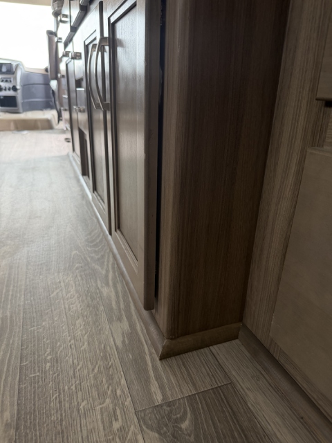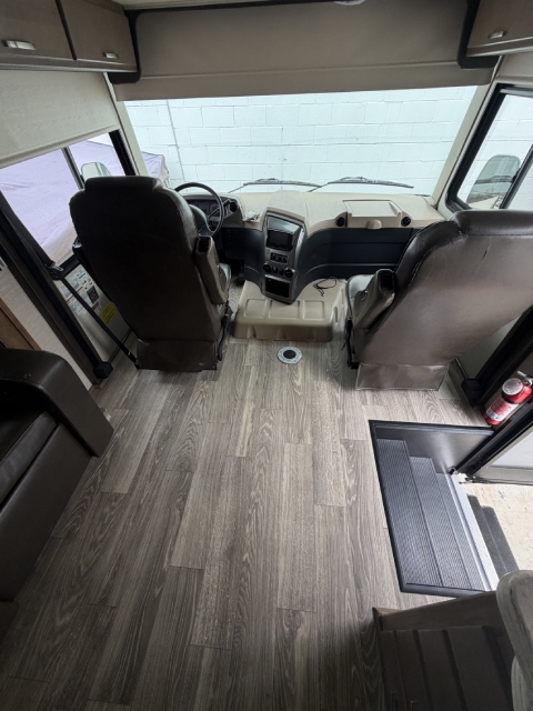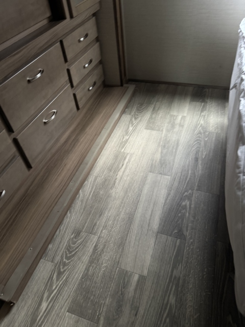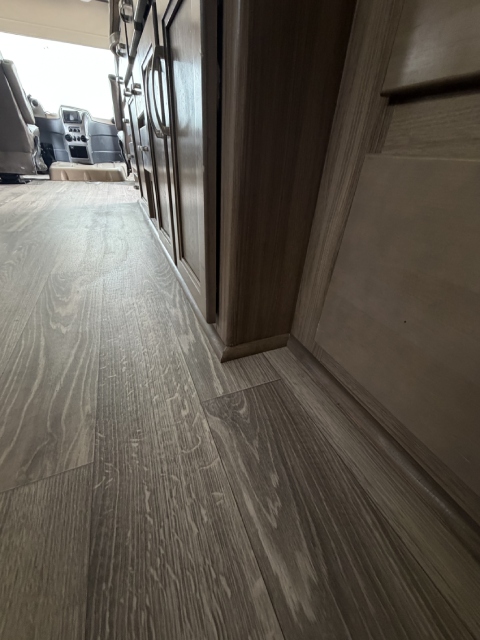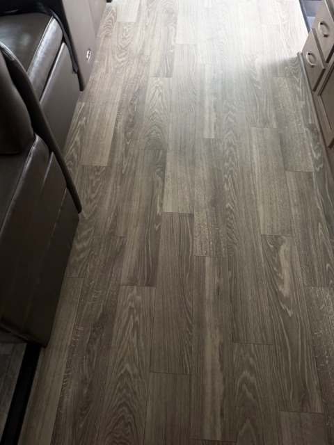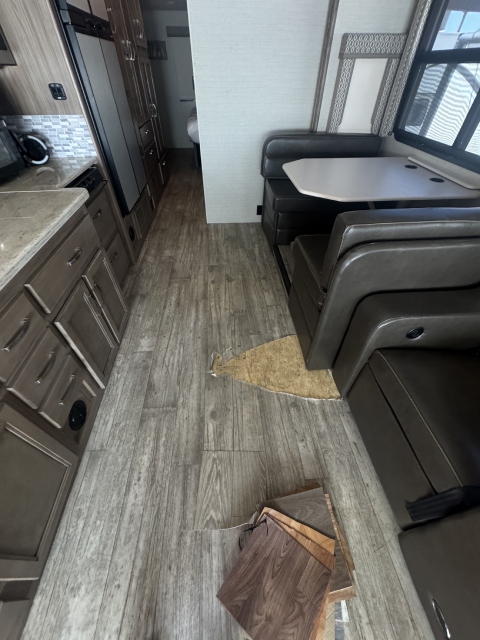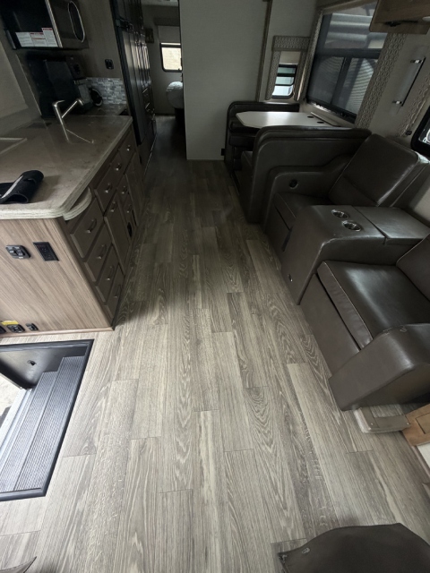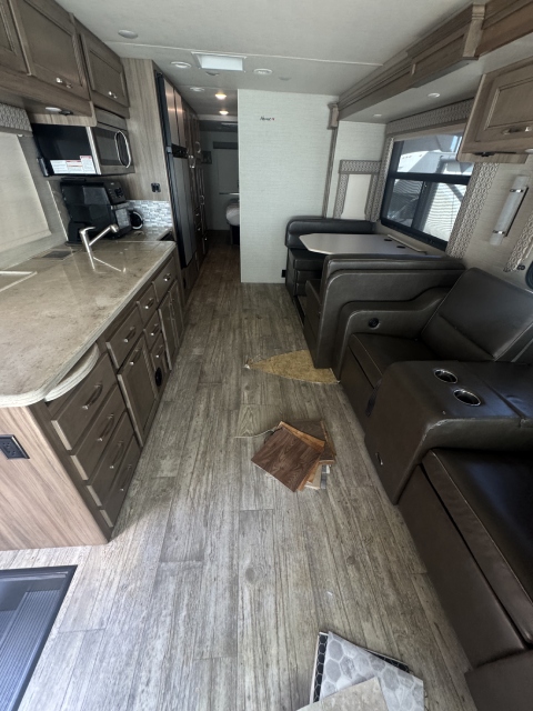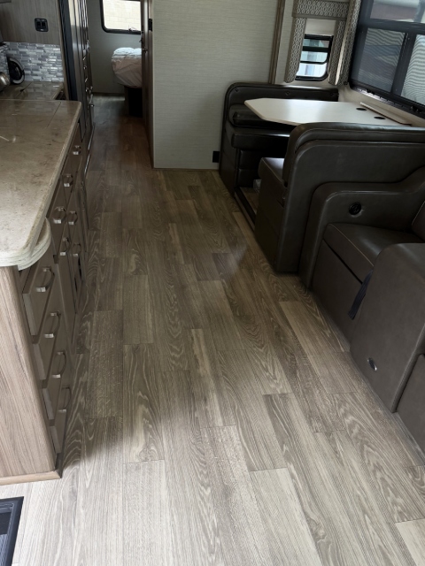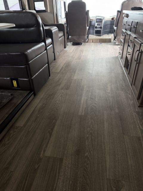 We replaced the damaged linoleum in a Jayco Precept Class A RV. One solid 35ft sheet created a fresh, seamless look. See before and after photos and video.