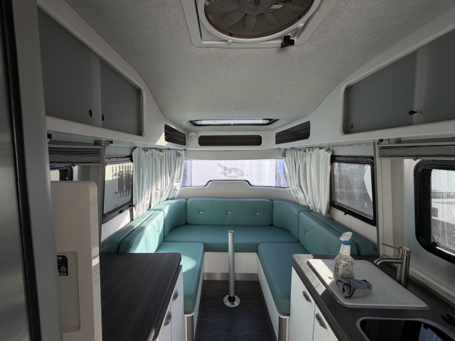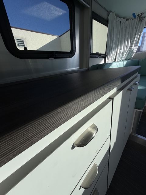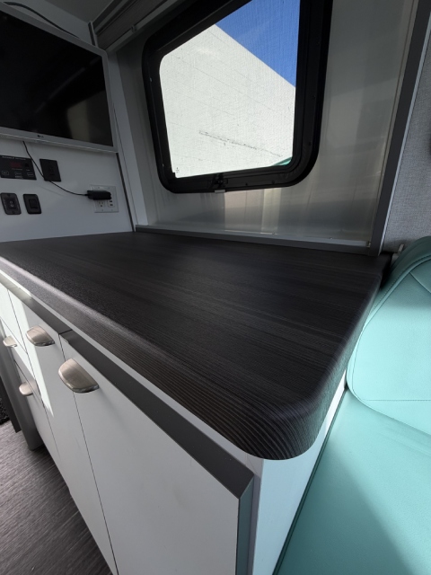This compact travel trailer needed a bit of repair. The cabinet surfaces had peeled, and the countertop was damaged. We removed the old materials and installed brand-new finishes. Check out the before-and-after photos in our gallery!