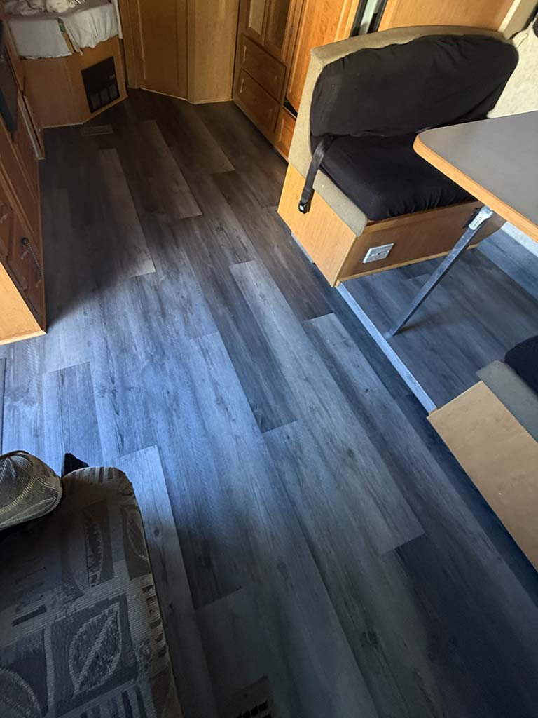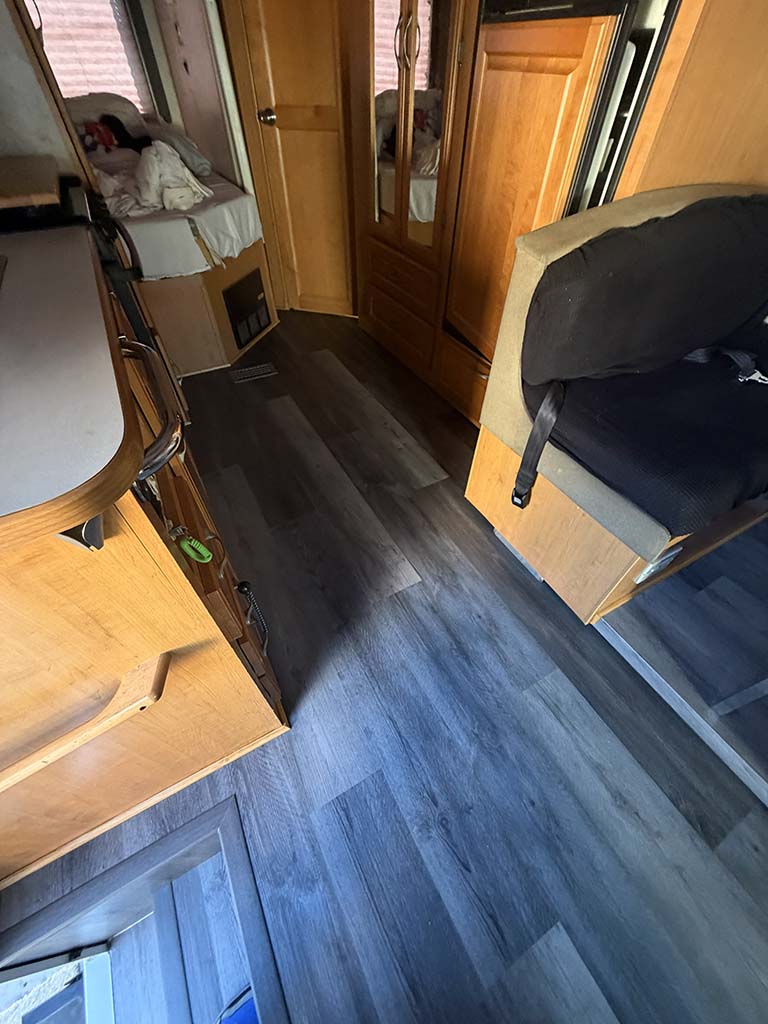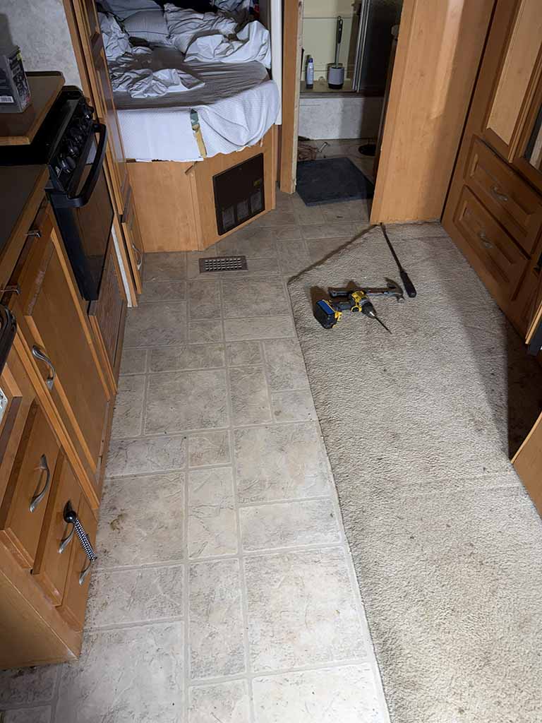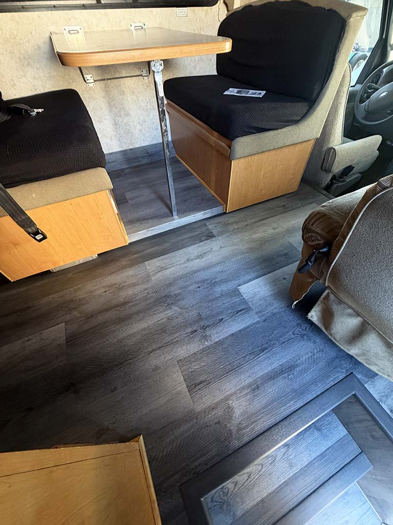A 25-foot Ford E-450 owner recently came to us with a request to replace the old flooring. In the photos below, you can see a combination of tile and carpet, clearly showing signs of many trips over the years. So we decided that new vinyl plank flooring in a Ford E-450 would be the perfect solution.