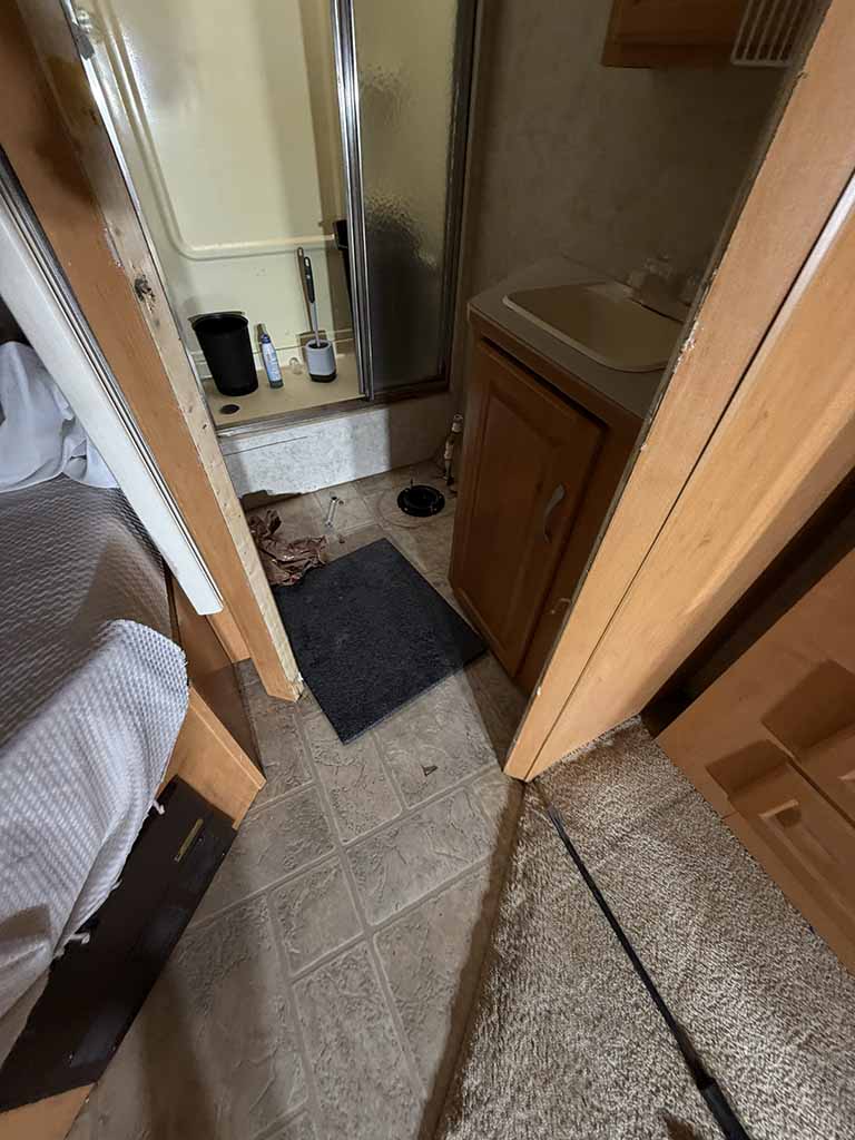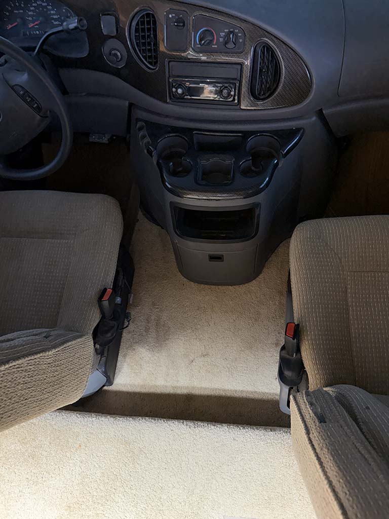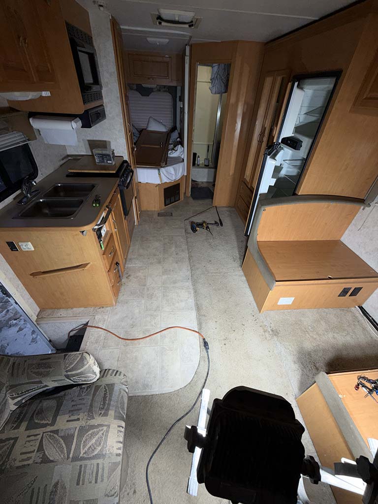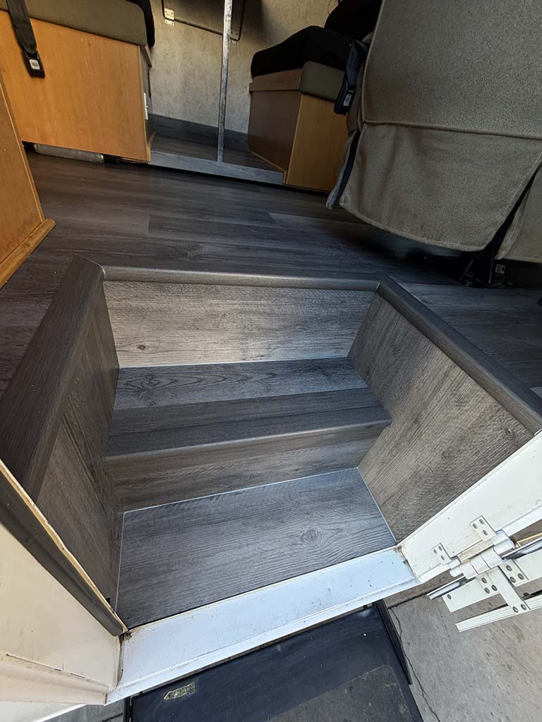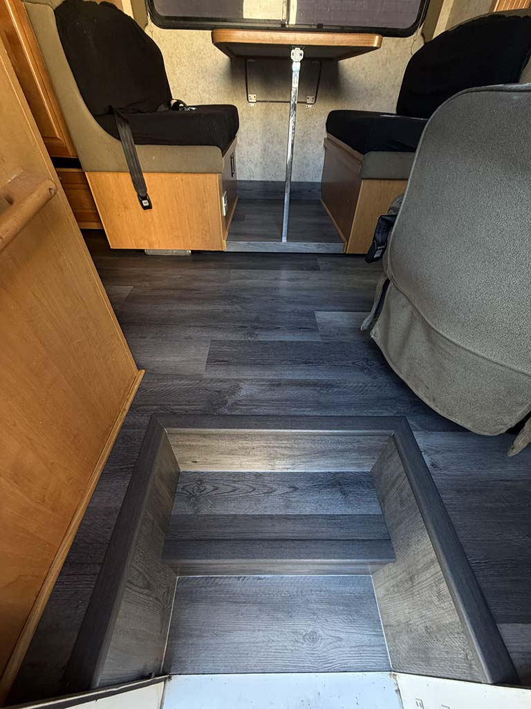 A 25-foot Ford E-450 owner recently came to us with a request to replace the old flooring. In the photos below, you can see a combination of tile and carpet, clearly showing signs of many trips over the years. So we decided that new vinyl plank flooring in a Ford E-450 would be the perfect solution.