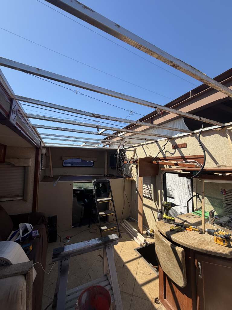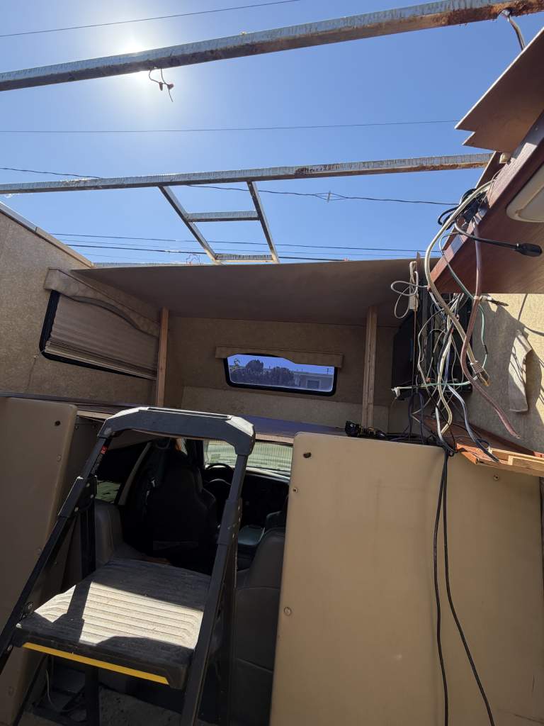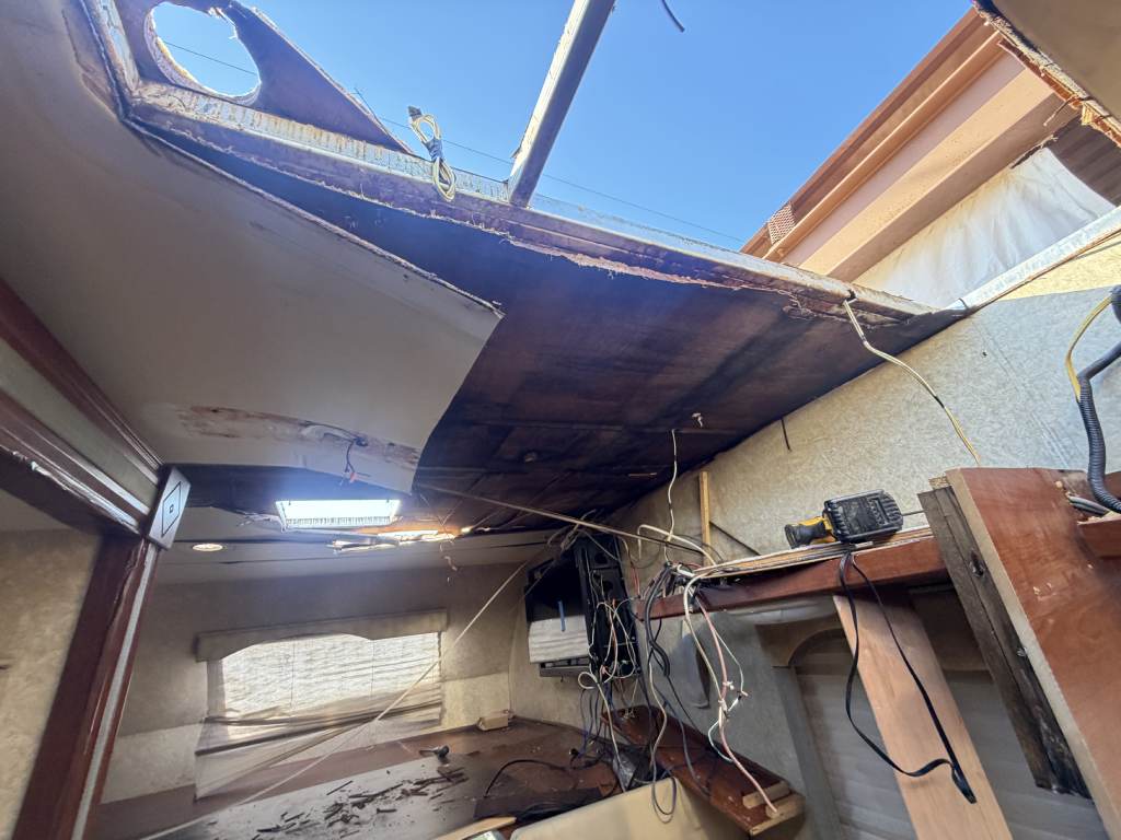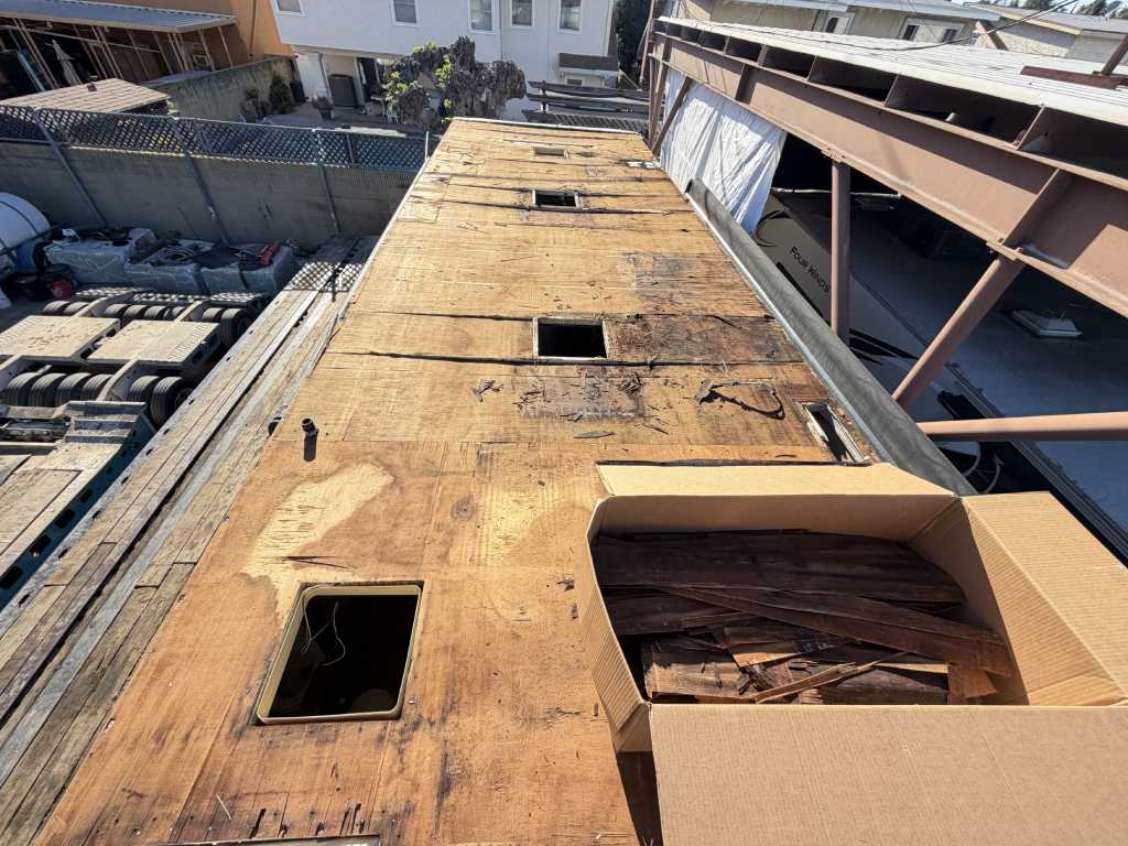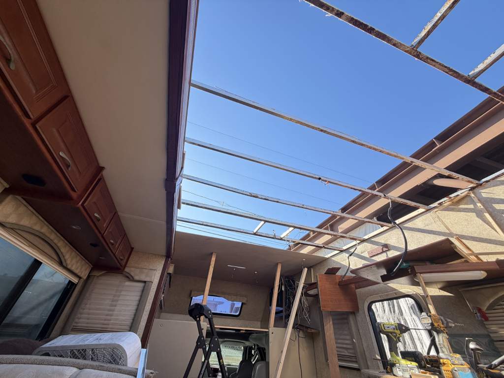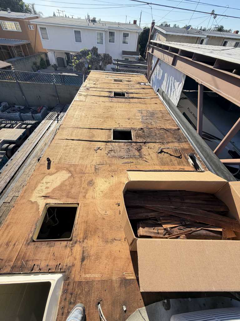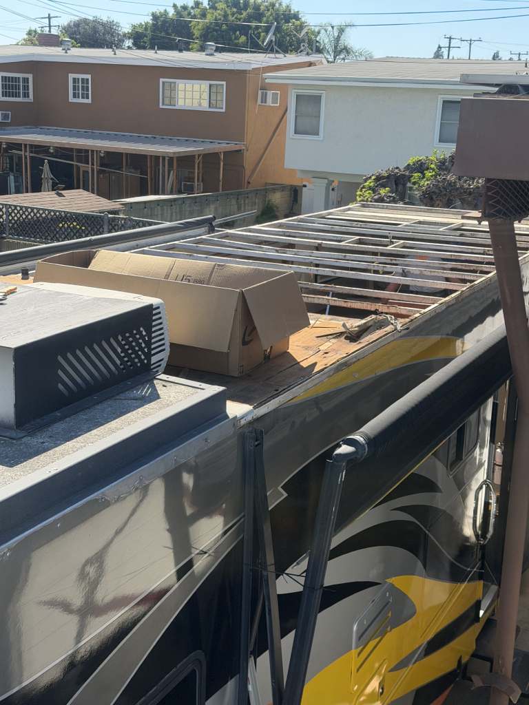 This project focused on repairing damaged RV roof on Four Winds Fun Mover. We reinforced the structure and converted the flat roof into a curved design. This change helps water drain off the sides instead of staying on top. The full project was completed in just two weeks. Below, you can see the full process in videos and photos. We also completed light interior updates, which are shown further on this page.