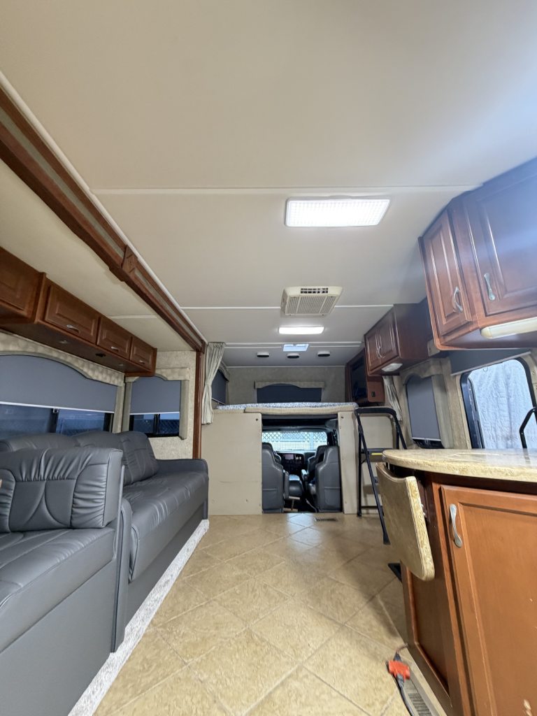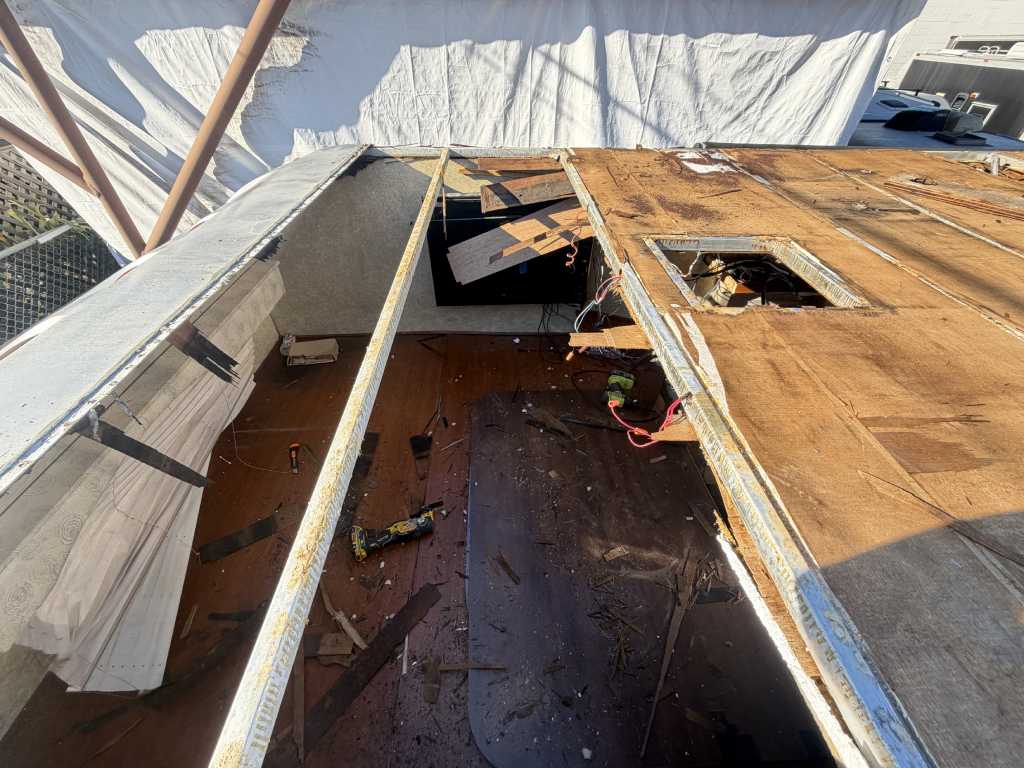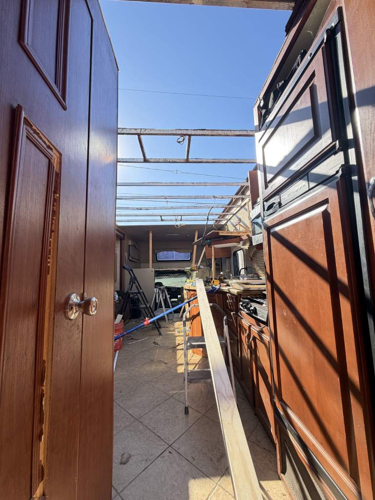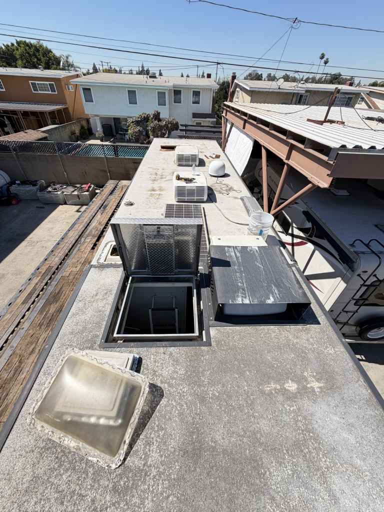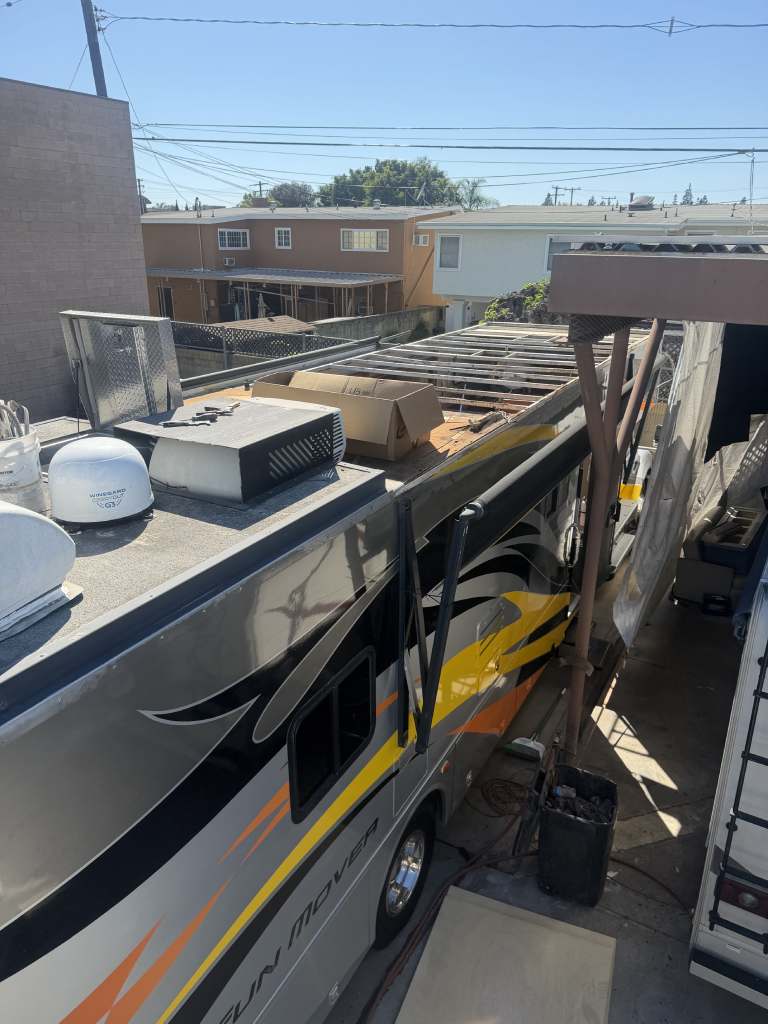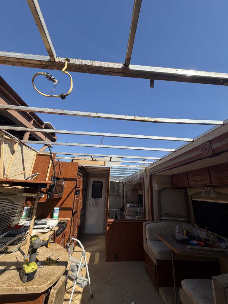 This project focused on repairing damaged RV roof on Four Winds Fun Mover. We reinforced the structure and converted the flat roof into a curved design. This change helps water drain off the sides instead of staying on top. The full project was completed in just two weeks. Below, you can see the full process in videos and photos. We also completed light interior updates, which are shown further on this page.